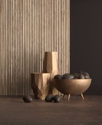 В фокусе внимания находится покрытие Tuet — первый продукт компании Arpa из серии Deep Surface — в цвете Caravella Light на передней панели острова. Выделяясь на темном фоне, его рельефные вертикальные полоски увеличивают контрастность интерьера. Комбинирование разных текстур усиливает насыщенность пространства, а расположенные над островом волнообразные светильники подчеркивают динамичность и современный стиль этого интерьера.