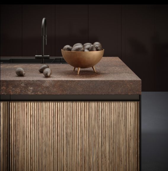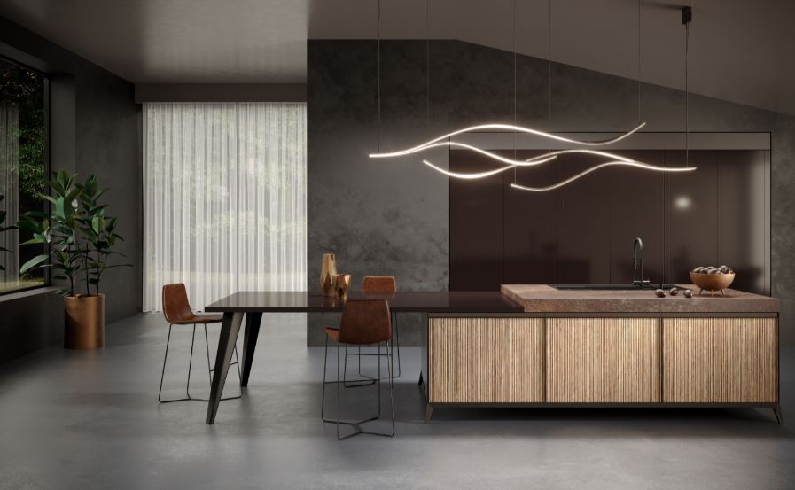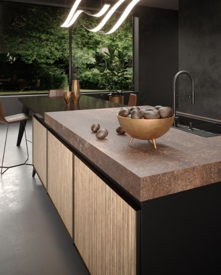 В фокусе внимания находится покрытие Tuet — первый продукт компании Arpa из серии Deep Surface — в цвете Caravella Light на передней панели острова. Выделяясь на темном фоне, его рельефные вертикальные полоски увеличивают контрастность интерьера. Комбинирование разных текстур усиливает насыщенность пространства, а расположенные над островом волнообразные светильники подчеркивают динамичность и современный стиль этого интерьера.